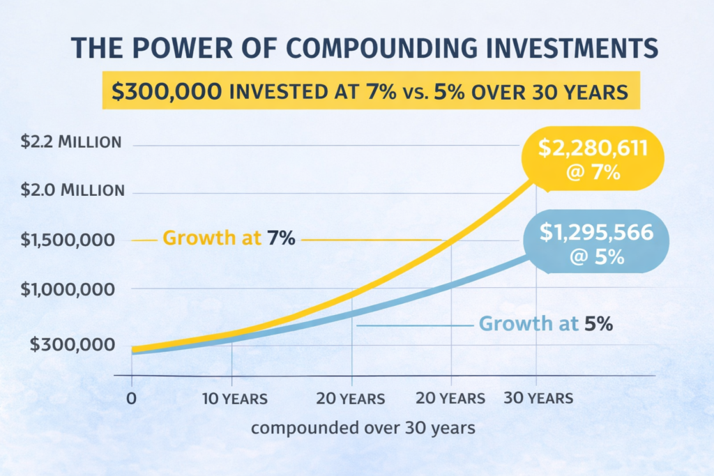 A $300,000 investment earning 7% annually grows to over $2.28 million in 30 years, while the same portfolio earning 5% reaches approximately $1.29 million — illustrating how small differences in return compound dramatically over time.